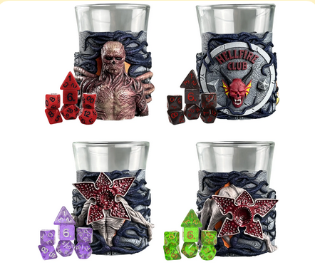 Bring the Upside Down to your gaming table with Stranger Things Mini Dice Cups—a must-have or RPG fans and Stranger Things collectors alike. Made from glass and featuring detailed sculpts of iconic creatures and themes from the hit Netflix series, these mini dice cups combine style, function, and fandom. Each cup comes paired with a complete 8-piece mini polyhedral dice set, perfect for your favorite tabletop RPG. Choose from four collectible designs—Vecna, Demogorgon, Demodog (plus Dart), and the Hellfire Club logo—or collect them all to complete your Hawkins-themed set. Whether you’re rolling for initiative or displaying them on your shelf, these dice cups are the perfect blend of function and fandom.